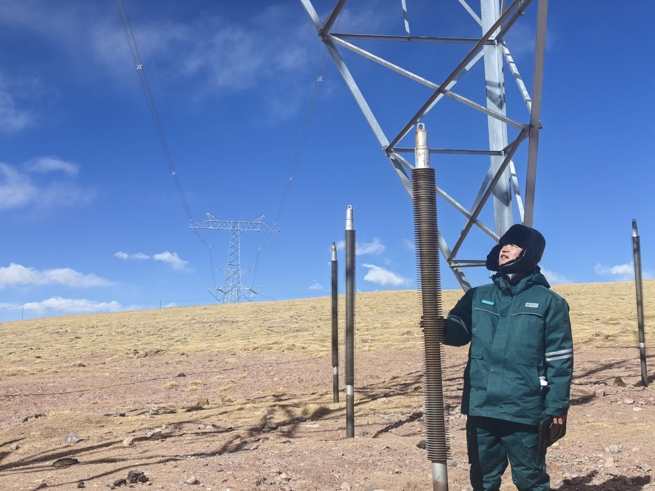 除了无人机巡检,班组员工还化身高原冻土的“把脉人”。针对冻土冻胀融沉对铁塔基础的威胁,坚持监测热棒、测量铁塔、分析数据,严密观测冻土变化。